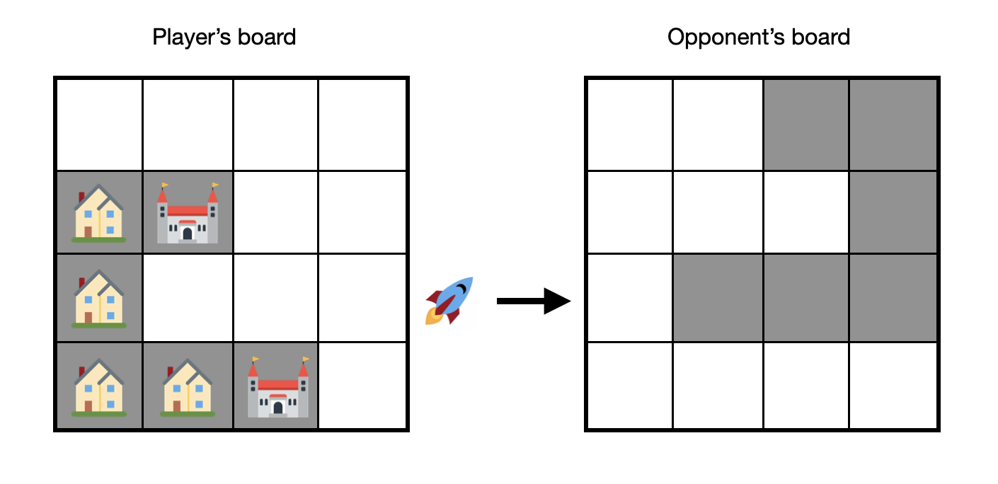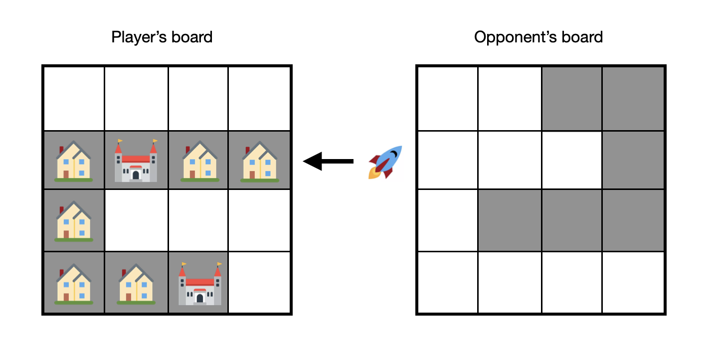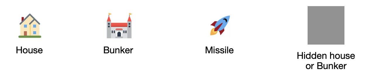 🚀 Send a missile to a row of the opponent's grid: the missile will destroy all unprotected houses on the row, decreasing the score of the opponent! The missile stops if there is a bunker on the row, and does not destroy it. All houses below the bunker are thus safe for the whole game. A player cannot send 2 missiles in a row.